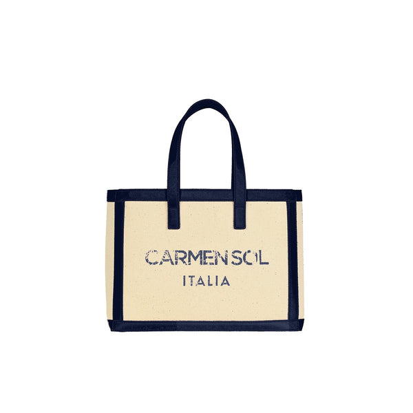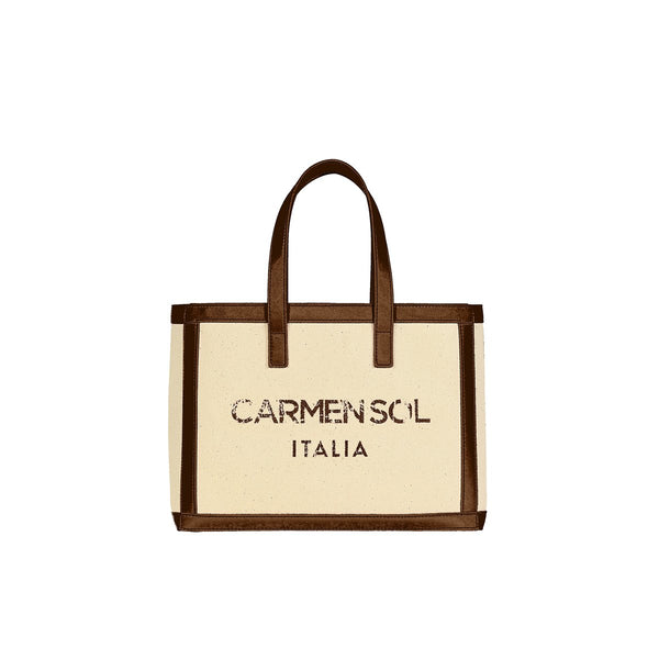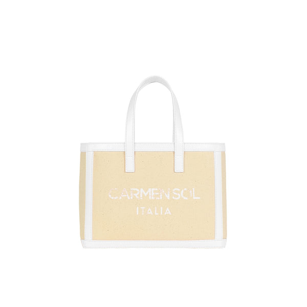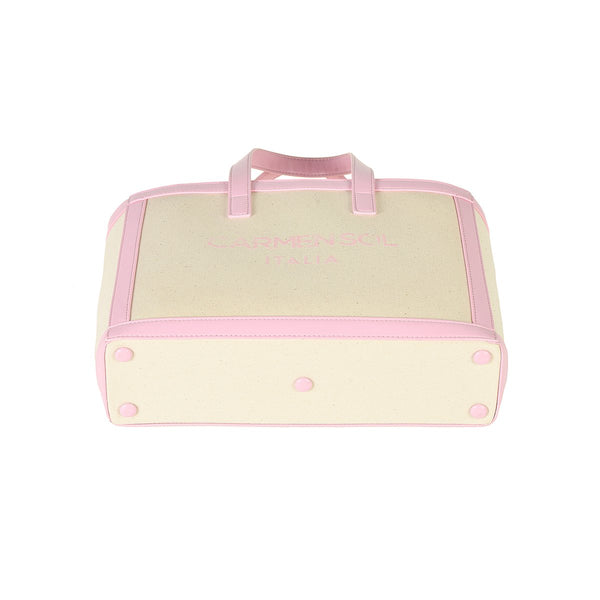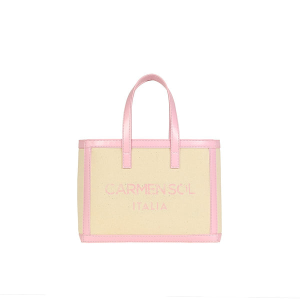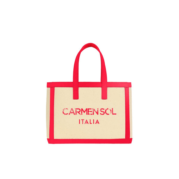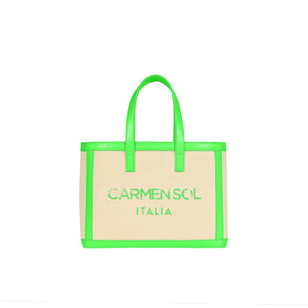 Mini tote crafted from colorful vegan leather trim and canvas.