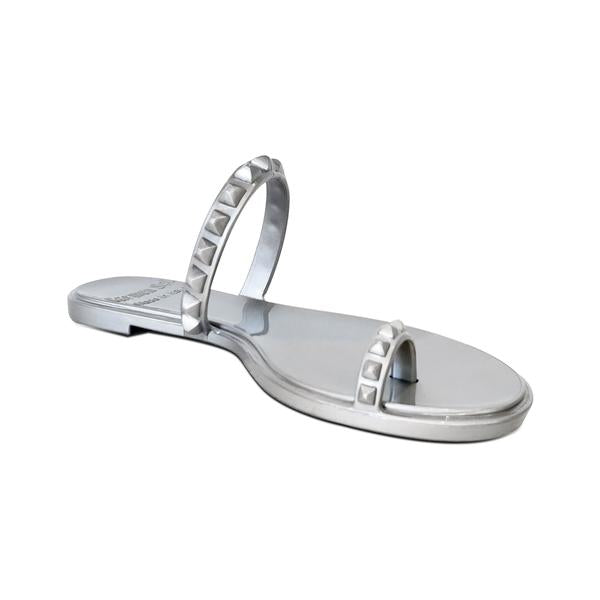 • Flat sandal with studded toe ring and studded strap, cushioned inner sole, well-defined ridges on the outsole