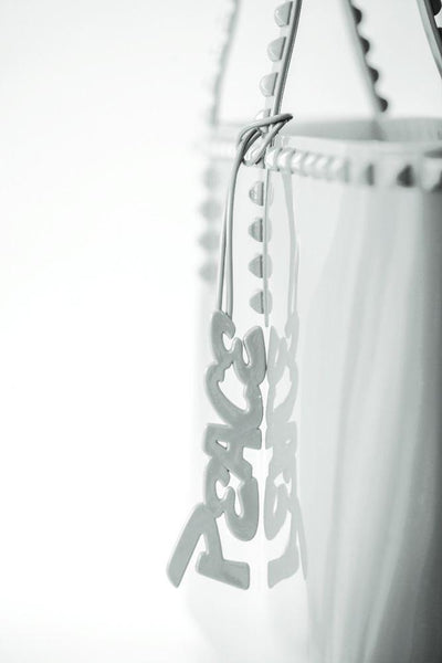 - This jelly charm says “Peace” in capital letters and a fun font.